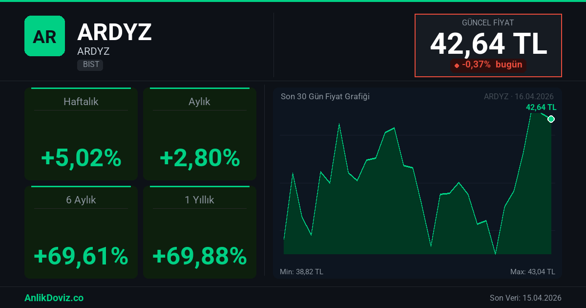 AnlikDoviz.co piyasa verilerine göre, ARDYZ hissesi son 1 yıllık dönemde yatırımcısına %69,88 oranında kazanç yaşattı. 16.04.2025 tarihinde 25,10 TL seviyesinden işlem gören ARDYZ, 15.04.2026 kapanışını 42,64 TL seviyesinden gerçekleştirdi. Bu süreçte hisse başına +17,54 TL'lik değişim gözlemlendi.