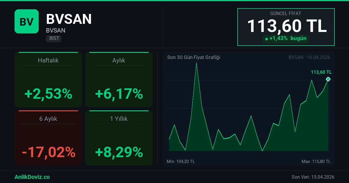 AnlikDoviz.co piyasa verilerine göre, BVSAN hissesi son 1 yıllık dönemde yatırımcısına %8,29 oranında kazanç yaşattı. 16.04.2025 tarihinde 104,90 TL seviyesinden işlem gören BVSAN, 15.04.2026 kapanışını 113,60 TL seviyesinden gerçekleştirdi. Bu süreçte hisse başına +8,70 TL'lik değişim gözlemlendi.