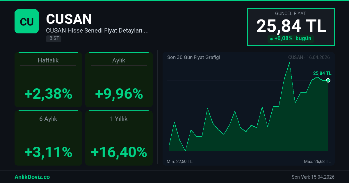AnlikDoviz.co piyasa verilerine göre, CUSAN hissesi son 1 yıllık dönemde yatırımcısına %16,40 oranında kazanç yaşattı. 16.04.2025 tarihinde 22,20 TL seviyesinden işlem gören CUSAN, 15.04.2026 kapanışını 25,84 TL seviyesinden gerçekleştirdi. Bu süreçte hisse başına +3,64 TL'lik değişim gözlemlendi.