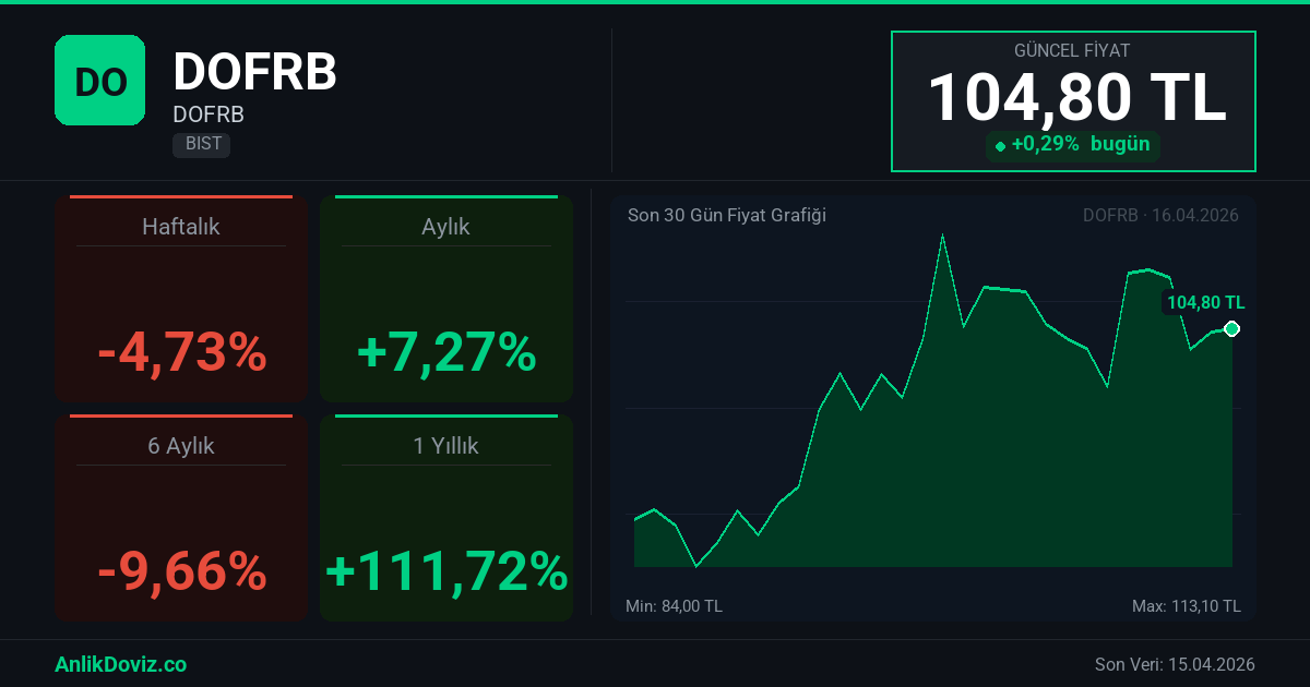AnlikDoviz.co piyasa verilerine göre, DOFRB hissesi son 1 yıllık dönemde yatırımcısına %111,72 oranında kazanç yaşattı. 11.09.2025 tarihinde 49,50 TL seviyesinden işlem gören DOFRB, 15.04.2026 kapanışını 104,80 TL seviyesinden gerçekleştirdi. Bu süreçte hisse başına +55,30 TL'lik değişim gözlemlendi.