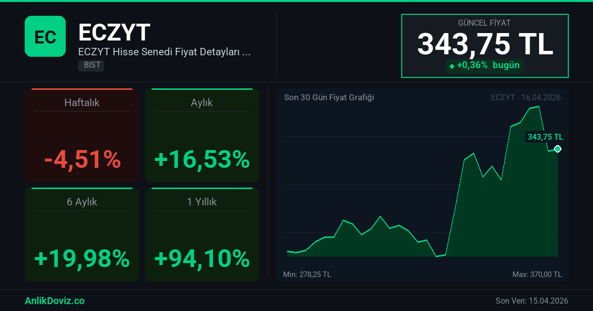 AnlikDoviz.co piyasa verilerine göre, ECZYT hissesi son 1 yıllık dönemde yatırımcısına %94,10 oranında kazanç yaşattı. 16.04.2025 tarihinde 177,10 TL seviyesinden işlem gören ECZYT, 15.04.2026 kapanışını 343,75 TL seviyesinden gerçekleştirdi. Bu süreçte hisse başına +166,65 TL'lik değişim gözlemlendi.