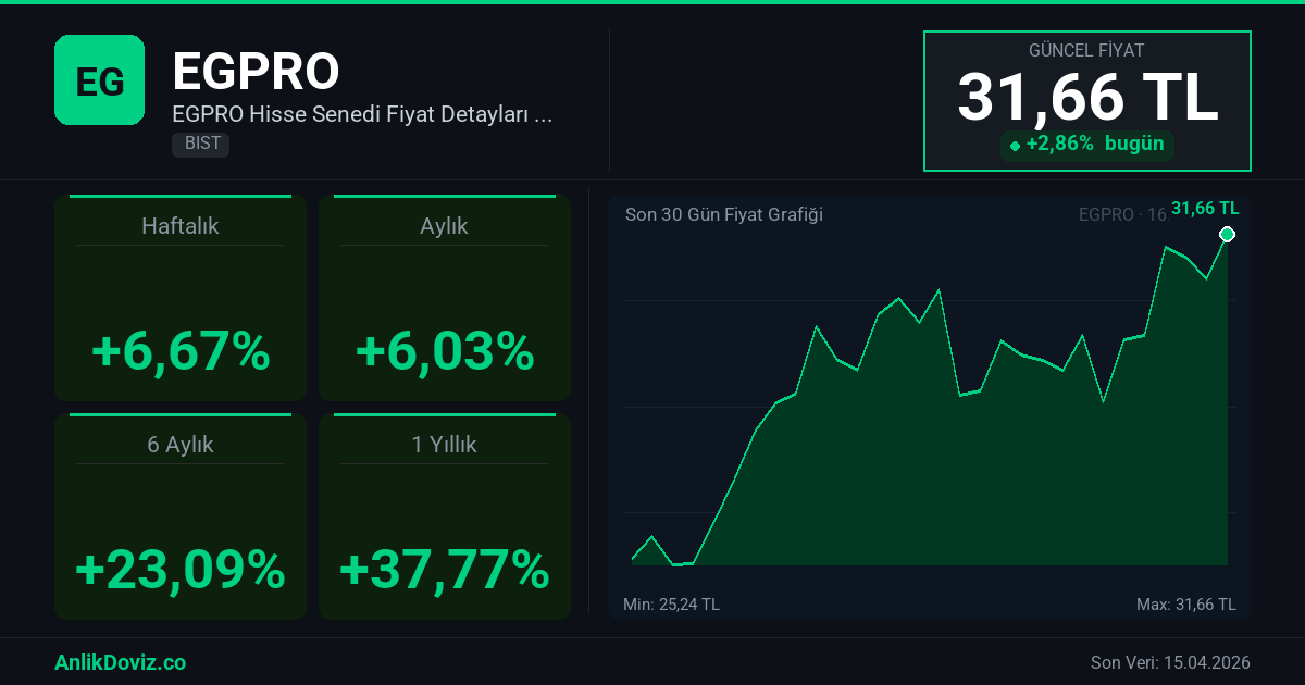 AnlikDoviz.co piyasa verilerine göre, EGPRO hissesi son 1 yıllık dönemde yatırımcısına %37,77 oranında kazanç yaşattı. 16.04.2025 tarihinde 22,98 TL seviyesinden işlem gören EGPRO, 15.04.2026 kapanışını 31,66 TL seviyesinden gerçekleştirdi. Bu süreçte hisse başına +8,68 TL'lik değişim gözlemlendi.