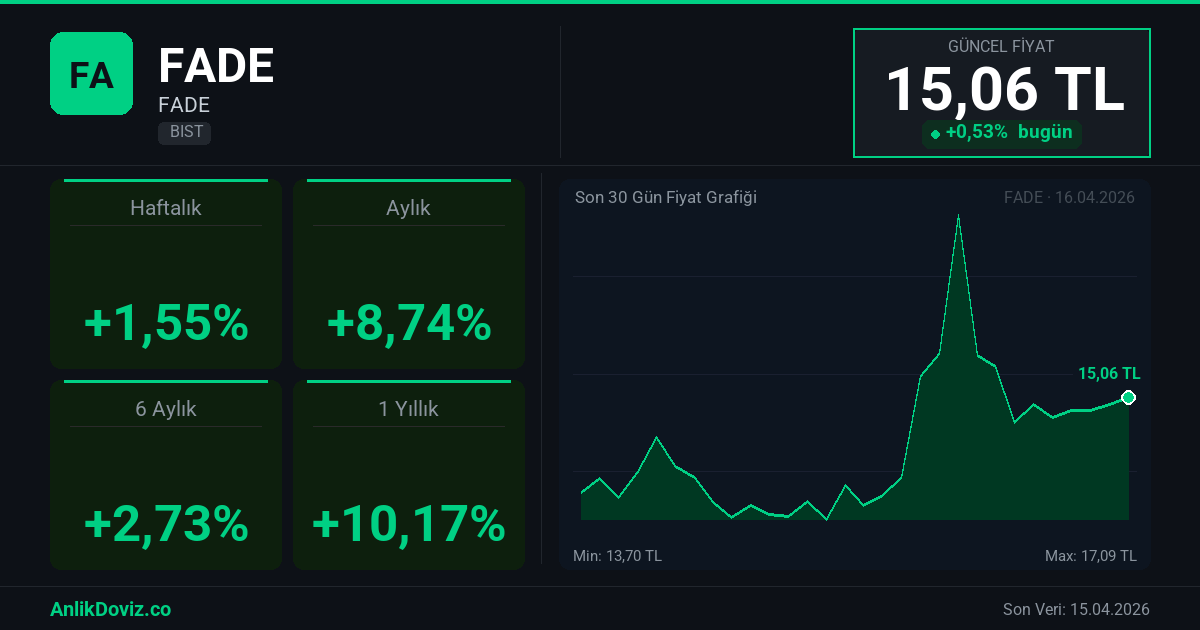 AnlikDoviz.co piyasa verilerine göre, FADE hissesi son 1 yıllık dönemde yatırımcısına %10,17 oranında kazanç yaşattı. 16.04.2025 tarihinde 13,67 TL seviyesinden işlem gören FADE, 15.04.2026 kapanışını 15,06 TL seviyesinden gerçekleştirdi. Bu süreçte hisse başına +1,39 TL'lik değişim gözlemlendi.