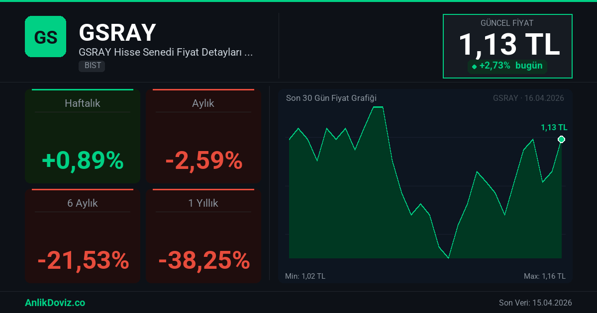 AnlikDoviz.co piyasa verilerine göre, GSRAY hissesi son 1 yıllık dönemde yatırımcısına %-38,25 oranında kayıp yaşattı. 16.04.2025 tarihinde 1,83 TL seviyesinden işlem gören GSRAY, 15.04.2026 kapanışını 1,13 TL seviyesinden gerçekleştirdi. Bu süreçte hisse başına -0,70 TL'lik değişim gözlemlendi.