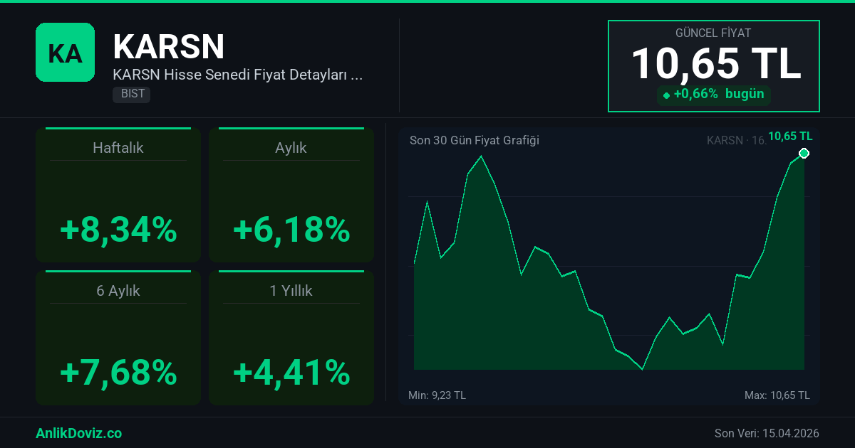 AnlikDoviz.co piyasa verilerine göre, KARSN hissesi son 1 yıllık dönemde yatırımcısına %4,41 oranında kazanç yaşattı. 16.04.2025 tarihinde 10,20 TL seviyesinden işlem gören KARSN, 15.04.2026 kapanışını 10,65 TL seviyesinden gerçekleştirdi. Bu süreçte hisse başına +0,45 TL'lik değişim gözlemlendi.