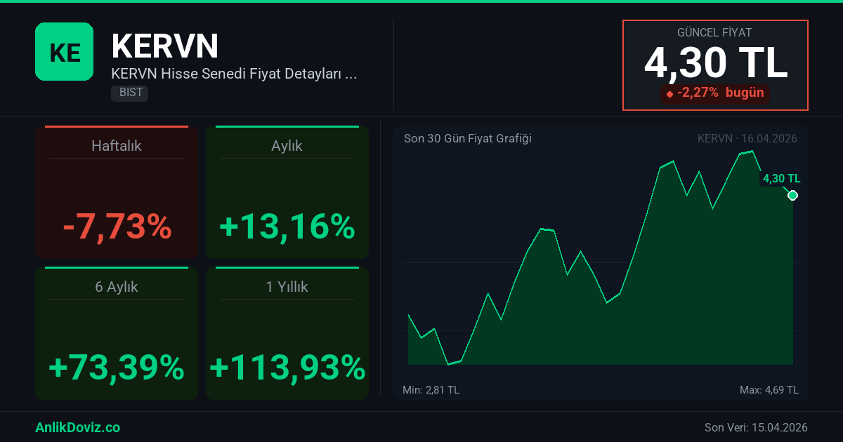 AnlikDoviz.co piyasa verilerine göre, KERVN hissesi son 1 yıllık dönemde yatırımcısına %113,93 oranında kazanç yaşattı. 16.04.2025 tarihinde 2,01 TL seviyesinden işlem gören KERVN, 15.04.2026 kapanışını 4,30 TL seviyesinden gerçekleştirdi. Bu süreçte hisse başına +2,29 TL'lik değişim gözlemlendi.