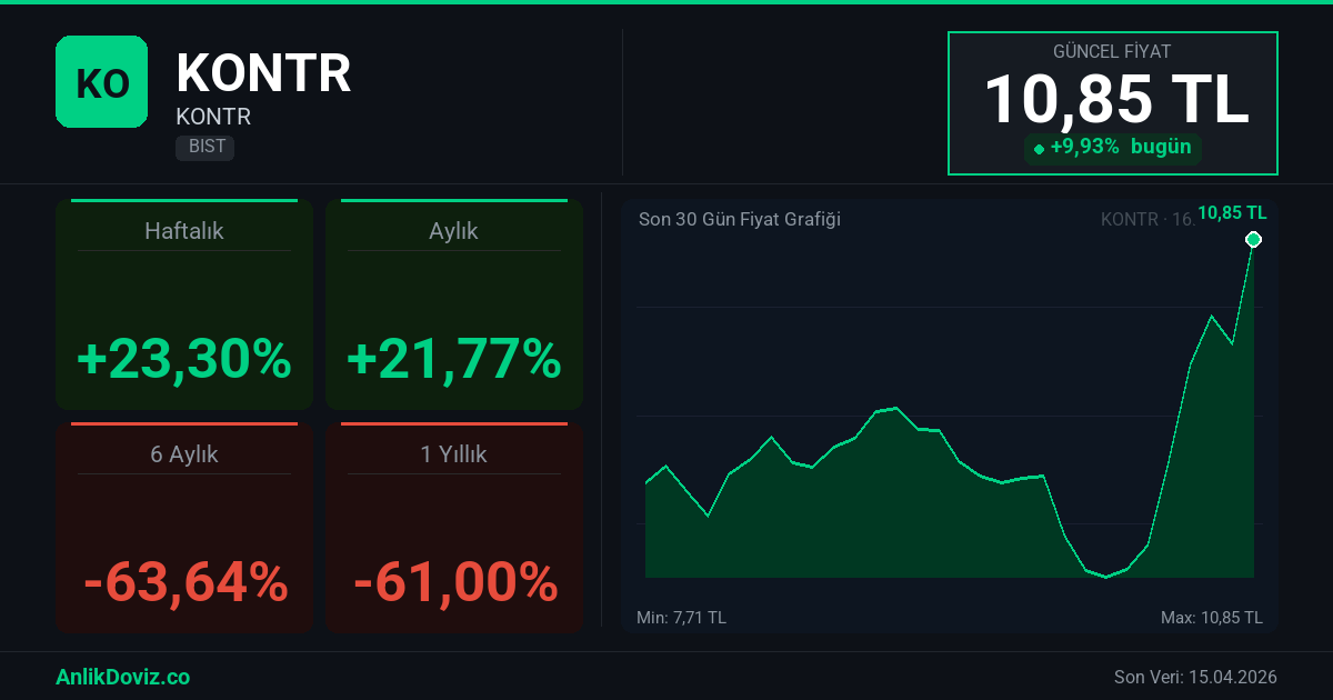 AnlikDoviz.co piyasa verilerine göre, KONTR hissesi son 1 yıllık dönemde yatırımcısına %-61,00 oranında kayıp yaşattı. 16.04.2025 tarihinde 27,82 TL seviyesinden işlem gören KONTR, 15.04.2026 kapanışını 10,85 TL seviyesinden gerçekleştirdi. Bu süreçte hisse başına -16,97 TL'lik değişim gözlemlendi.