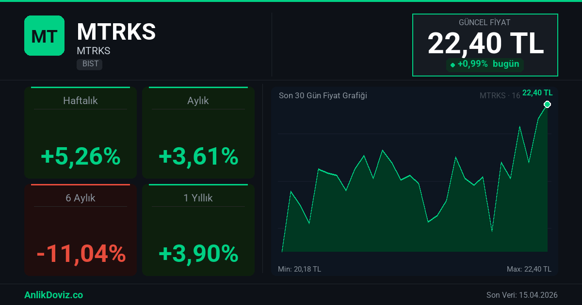 AnlikDoviz.co piyasa verilerine göre, MTRKS hissesi son 1 yıllık dönemde yatırımcısına %3,90 oranında kazanç yaşattı. 16.04.2025 tarihinde 21,56 TL seviyesinden işlem gören MTRKS, 15.04.2026 kapanışını 22,40 TL seviyesinden gerçekleştirdi. Bu süreçte hisse başına +0,84 TL'lik değişim gözlemlendi.