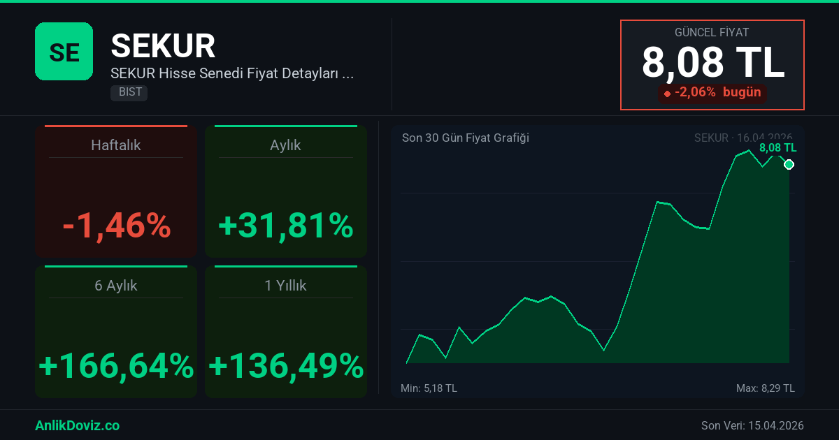 AnlikDoviz.co piyasa verilerine göre, SEKUR hissesi son 1 yıllık dönemde yatırımcısına %136,49 oranında kazanç yaşattı. 16.04.2025 tarihinde 3,42 TL seviyesinden işlem gören SEKUR, 15.04.2026 kapanışını 8,08 TL seviyesinden gerçekleştirdi. Bu süreçte hisse başına +4,66 TL'lik değişim gözlemlendi.