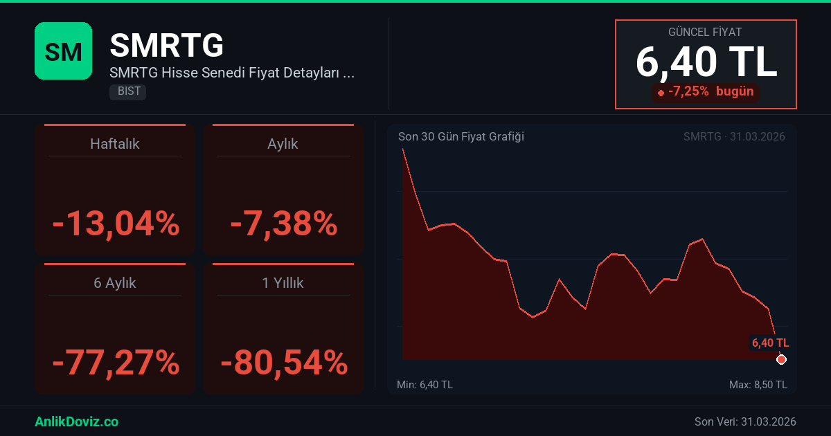 AnlikDoviz.co piyasa verilerine göre, SMRTG hissesi son 1 yıllık dönemde yatırımcısına %-80,54 oranında kayıp yaşattı. 02.04.2025 tarihinde 32,88 TL seviyesinden işlem gören SMRTG, 31.03.2026 kapanışını 6,40 TL seviyesinden gerçekleştirdi. Bu süreçte hisse başına -26,48 TL'lik değişim gözlemlendi.