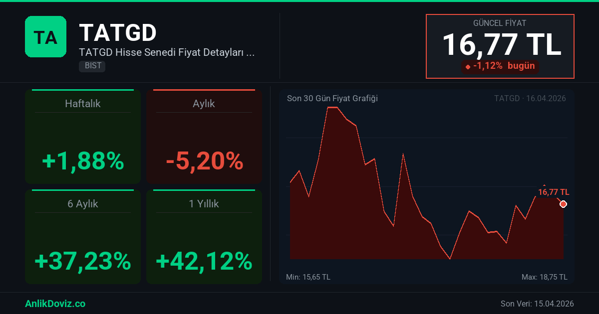 AnlikDoviz.co piyasa verilerine göre, TATGD hissesi son 1 yıllık dönemde yatırımcısına %42,12 oranında kazanç yaşattı. 16.04.2025 tarihinde 11,80 TL seviyesinden işlem gören TATGD, 15.04.2026 kapanışını 16,77 TL seviyesinden gerçekleştirdi. Bu süreçte hisse başına +4,97 TL'lik değişim gözlemlendi.