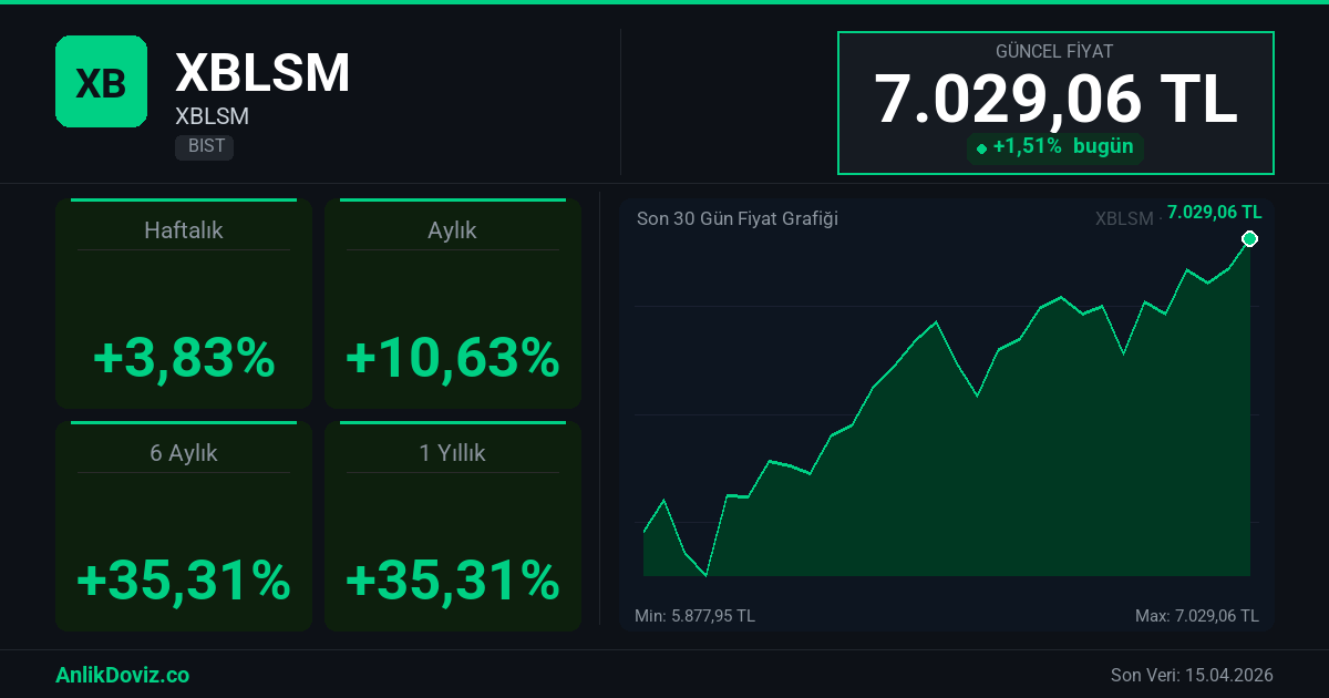 AnlikDoviz.co piyasa verilerine göre, XBLSM hissesi son 1 yıllık dönemde yatırımcısına %35,31 oranında kazanç yaşattı. 05.01.2026 tarihinde 5.194,70 TL seviyesinden işlem gören XBLSM, 15.04.2026 kapanışını 7.029,06 TL seviyesinden gerçekleştirdi. Bu süreçte hisse başına +1.834,36 TL'lik değişim gözlemlendi.