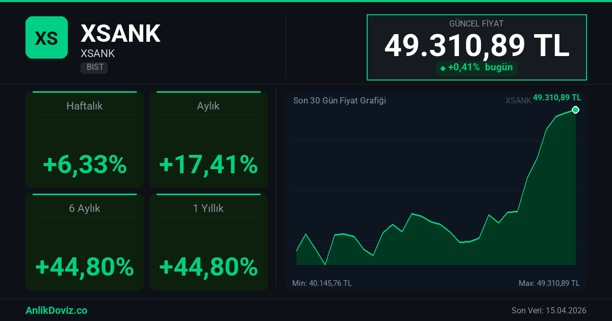 AnlikDoviz.co piyasa verilerine göre, XSANK hissesi son 1 yıllık dönemde yatırımcısına %44,80 oranında kazanç yaşattı. 05.01.2026 tarihinde 34.054,75 TL seviyesinden işlem gören XSANK, 15.04.2026 kapanışını 49.310,89 TL seviyesinden gerçekleştirdi. Bu süreçte hisse başına +15.256,14 TL'lik değişim gözlemlendi.