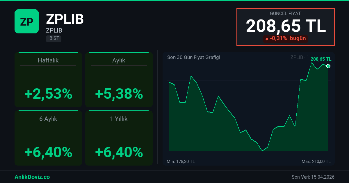 AnlikDoviz.co piyasa verilerine göre, ZPLIB hissesi son 1 yıllık dönemde yatırımcısına %6,40 oranında kazanç yaşattı. 02.01.2026 tarihinde 196,10 TL seviyesinden işlem gören ZPLIB, 15.04.2026 kapanışını 208,65 TL seviyesinden gerçekleştirdi. Bu süreçte hisse başına +12,55 TL'lik değişim gözlemlendi.