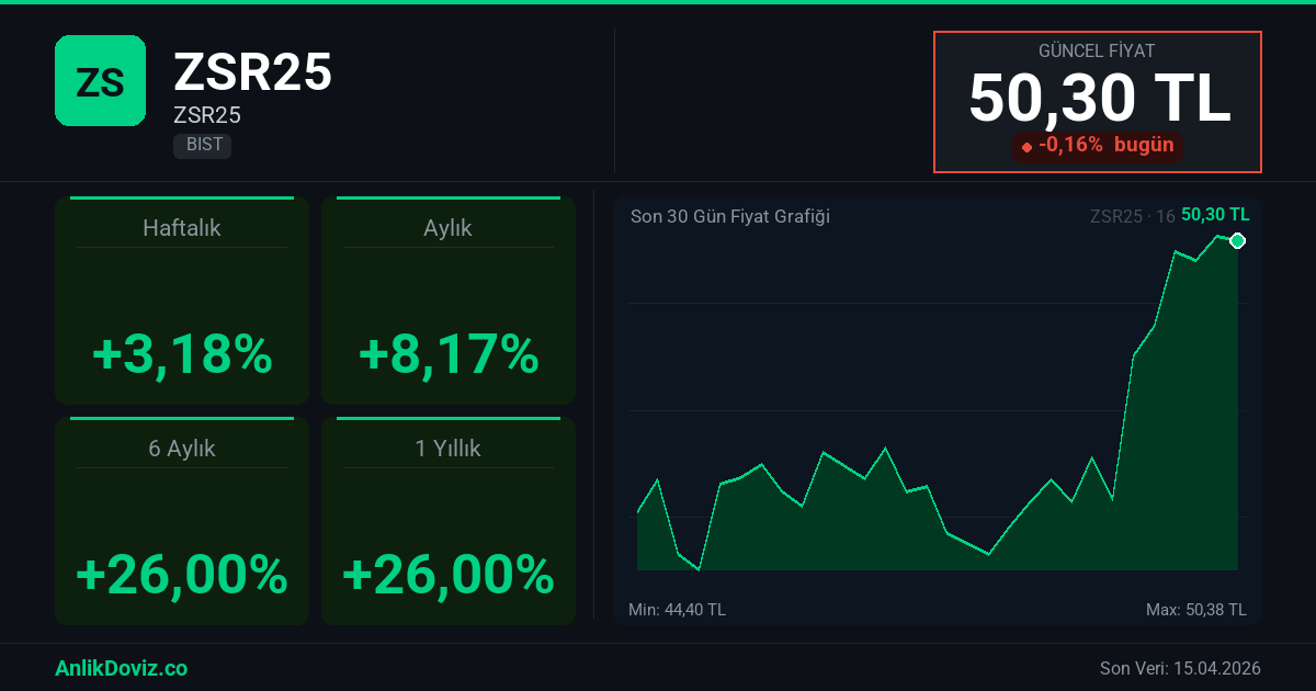 AnlikDoviz.co piyasa verilerine göre, ZSR25 hissesi son 1 yıllık dönemde yatırımcısına %26,00 oranında kazanç yaşattı. 02.01.2026 tarihinde 39,92 TL seviyesinden işlem gören ZSR25, 15.04.2026 kapanışını 50,30 TL seviyesinden gerçekleştirdi. Bu süreçte hisse başına +10,38 TL'lik değişim gözlemlendi.